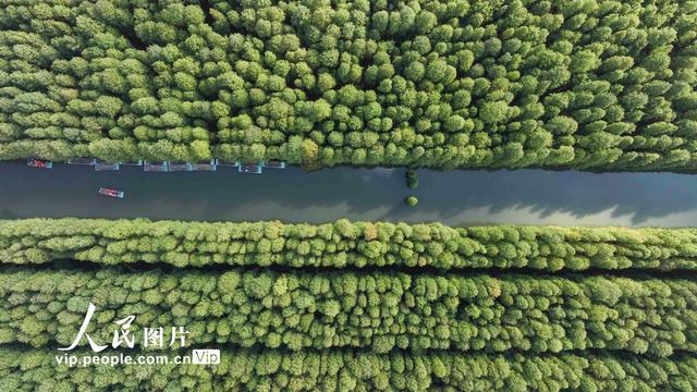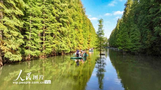 2024年11月7日,江苏省淮安市金湖水上森林公园内水杉树叶渐渐变色,与湖水勾勒出一幅美丽的初冬画卷,吸引众多游客前来游玩赏景,愉悦心情。赵启瑞摄(人民图片网)