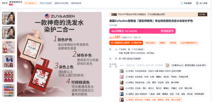 记者在某电商平台查询固色锁色洗发水,发现多款产品具备染发能力但的备案注册证号均为“妆”字号的产品,如EVEMORE、七色师、智雅宣、首品、丽嘉妮、EWEW、乐力等。其中,销量高的已售出1万多件,销量低的也有千余件,价格在30~140元。