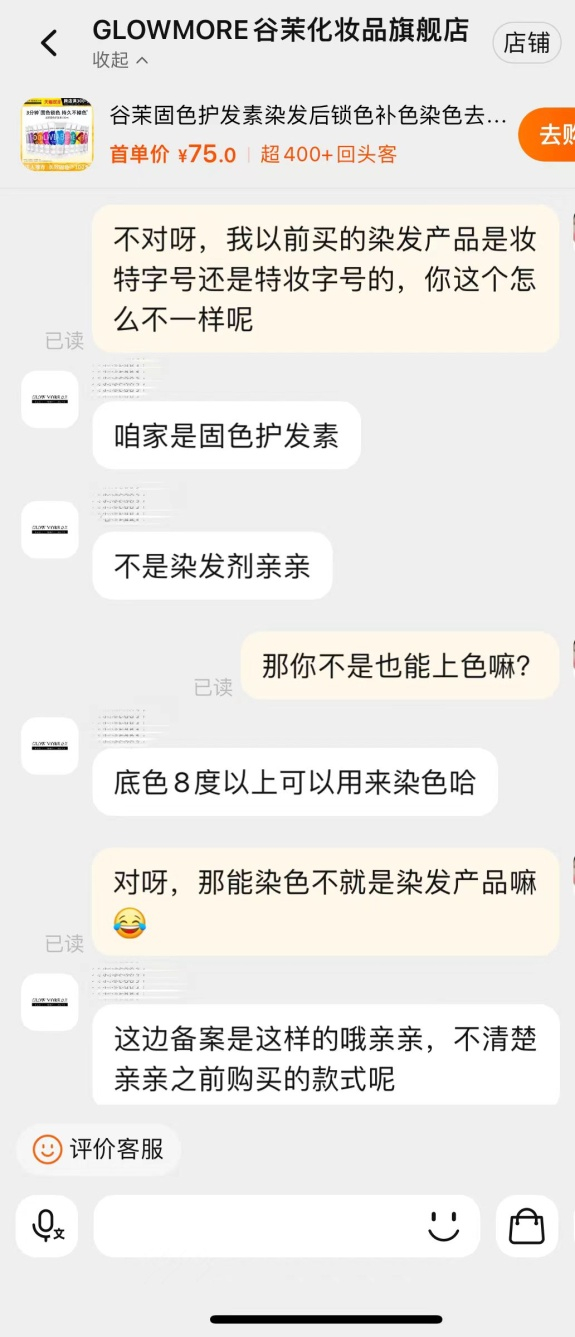 于是,沈女士联系产品店铺客服询问,对方回复称,产品为固色护发素,而非染发剂,产品备案情况如包装所示。