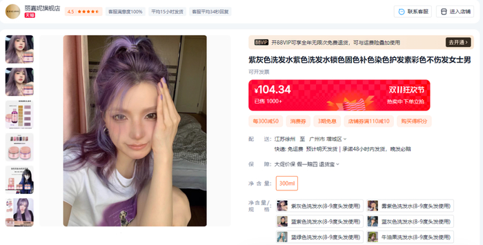 据Kiki回忆,10月中旬,她在染发后发现发质变差,于是在网上购买了一套能固色的洗发水套装(洗发水+护发素),希望能改善发质。但在首次使用后,头发被染成了其他颜色,当即进行清洗也无法恢复原来发色,让她十分生气。