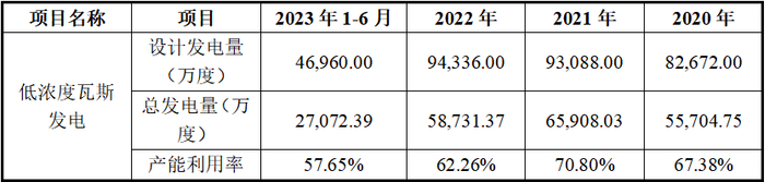 瓦斯发电站建设运营项目作为此次募投项目中唯一的产能扩建项目,发行人拟计划投资6,088.45万元。根据招股书披露,2020年至2023年1-6月,发行人低浓度瓦斯发电业务的产能利用率分别为67.38%、70.80%、62.26%、57.65%,几乎全在70%以下,如此低下的产能利用率完全没有投资扩产的必要,收缩减产似乎更为合理。