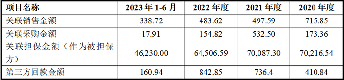 在屡屡遭受处罚的同时,发行人日常交易的违规风险也非常之高,各种关联交易频频发生。2020年度至2023年1-6月,发行人每年通过关联方实现销售金额分别为715.85万元、497.59万元、483.62万元、338.72万元,采购金额分别为173.36万元、532.50万元、154.82万元、17.91万元。相对营收规模来说,尽管金额并不大,但考虑到发行人的加权平均净资产收益率长期在8%的上市标准线上下浮动,如果没有关联方交易带来的利润,恐怕已经难以满足上市标准。不仅如此,关联方每年还为发行人提供了巨额担保,申报期各期的担保金额分别为70,216.54万元、70,087.30万元、64,506.59万元、46,230.00万元,而发行人最近一期净资产也不过83,955.15万元。很明显,发行人作为此次上市的主体,实控人黄朝华一直在不遗余力地将旗下其他企业的资源向发行人处倾斜,可谓集万千宠爱于一身。