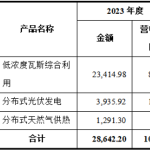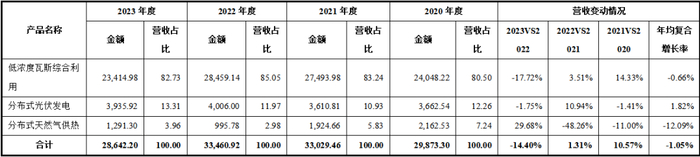 据招股书披露,公司主营业务为低浓度瓦斯综合利用业务,具体包括低浓度瓦斯发电、瓦斯综合利用装备研发制造及技术服务、超低浓度瓦斯氧化供热等业务;与此同时,为发挥在低浓度瓦斯综合利用业务领域积累的管理优势,发行人又于近年新开发了分布式光伏发电和分布式天然气供热业务。不过,从实际的发展情况来看,上述业务的发展并不均衡,低浓度瓦斯综合利用业务作为发行人的传统业务,其在公司营收中的占比一直稳定在80%以上,分布式光伏发电业务则一直稳定在11%左右,分布式天然气供热业务对营收贡献最小,且波动剧烈,具体情况见下表:
