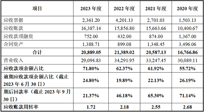 如上表,2020年度至2023年度,发行人尽管每年都能实现3亿元左右的营收规模,但也会形成2亿元左右的应收款项,应收款项余额占营业收入比重长期稳定在60%以上,最近一个会计年度更是飙升至71.80%,这意味这发行人每年至少6成的收入是通过赊销的方式实现的,销售的真实性和准确性风险都非常之高。实际情况也确实如此,截止2023年6月30日,发行人逾期应收款项占比分别为26.19%、22.13%、19.89%、24.80%,长期至少有20%以上的款项处于逾期状态。期后回款问题更为严重,截止2023年9月30日,发行人各期末的期后回款率分别只有71.14%、65.30%、46.18%、21.37%。要知道,上述期后回款统计时间距离会计报表截止日已经3个月,距离2020年的应收款项产生日期已经接近4年,仍然有如此大面积地款项未能收回,可见发行人在大客户面前是何等的卑微。议价能力的长期不足也严重影响到了发行人的营运能力,应收账款周转率从2020年度的2.68一路下滑至2023年的1.72,下降幅度相当之明显。