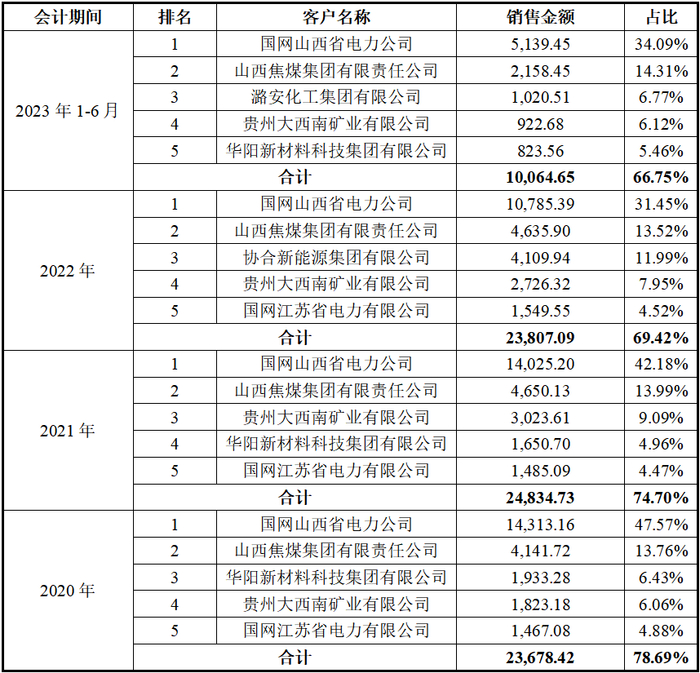 如上表,申报期内,发行人各期前五大客户营收占比分别为78.69%、74.70%、69.42%、66.75%,常年稳定在65%以上,且前五大客户相当固定,国网山西省电力公司、山西焦煤集团有限责任公司更是垄断了前两大客户。对个别客户的过度依赖显然不是什么好事情,这大大降低了发行人的议价能力。尤其是和这些实力雄厚的国资企业相比,发行人似乎并没有足够的讨价还价的筹码,在双方之间的合作中的弱势地位似乎过于明显,这突出地表现在应收款项逾期以及期后回款方面,具体情况如下: