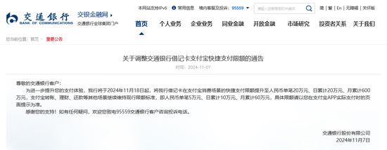 在公告中,交通银行表示,为进一步提升客户的支付体验,我行将于2024年11月18日起,将我行借记卡在支付宝消费场景的快捷支付限额提升至人民币单笔20万元、日累计20万元、月累计600万元,支付宝转账、理财、还款等其他场景继续维持现行限额标准,即人民币单笔5万元、日累计10万元、月累计60万元,具体限额请以客户在支付宝APP实际支付时的页面提示为准。