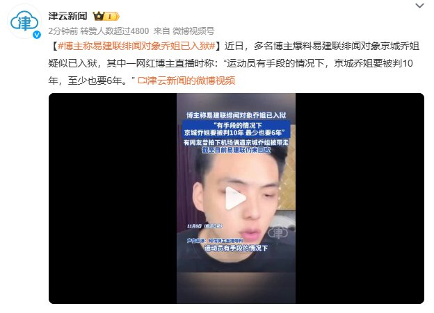 近日,多名博主爆料易建联绯闻对象京城乔姐疑似已入狱,其中一网红博主直播时称:“运动员有手段的情况下,京城乔姐要被判10年,至少也要6年。”