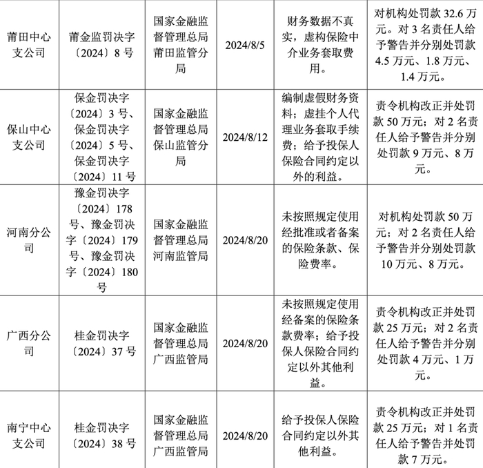 其中最新收到的罚单发布于10月25日,大地保险丽江中心支公司被国家金融监督管理总局丽江监管分局因“虚挂个人代理人业务套取手续费、编制虚假业务资料”处罚45万元,时任大地保险丽江中心支公司副总经理(主持工作)陈文涛被警告并罚款8万元。