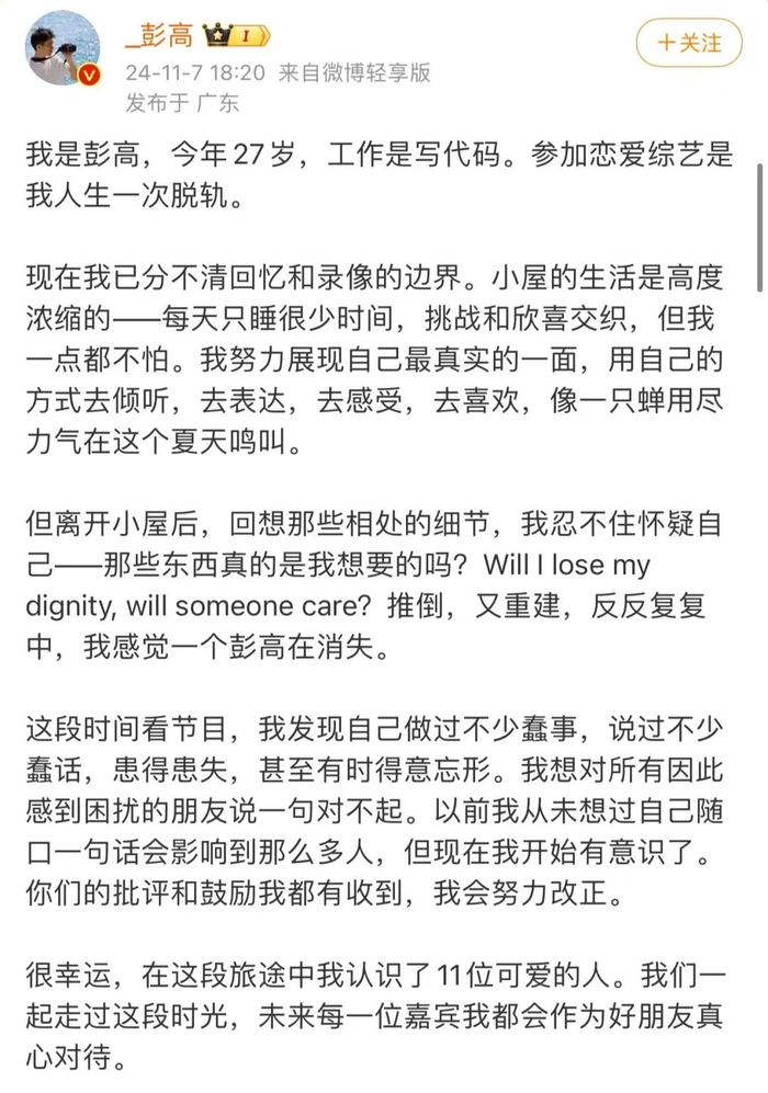 彭高在个人声明中回顾了他在节目中的体验,表示这是一个高度浓缩的经历,充满了挑战和欣喜。他表示在7月底与翁青雅进行了最后一次私下见面,随后因拍摄仍有几次碰面。经过深思熟虑,他认为朋友关系是最合适的状态。他还感谢了节目的其他参与者和支持他的朋友们。