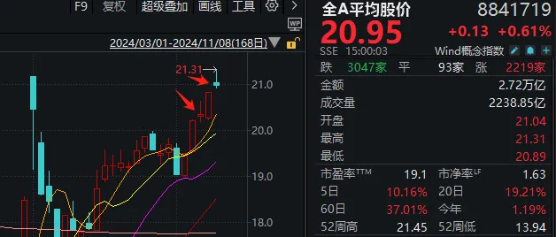同样的情况也发生在收涨0.61%的全A平均股价上。该指标不受个股加权影响,因此可视为最质朴的“全体A股”表现。