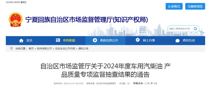 宁夏回族自治区市场监管厅发布2024年度车用汽柴油产品质量专项监督抽查结果