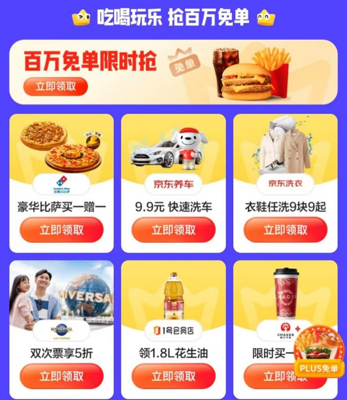在11月8日PLUS会员日活动当天的0点、10点、16点、20点,京东还将准时发放免单券,届时,PLUS会员点击进入免单专区即可领取,海底捞肥牛卷、11.11元无门槛新老会员共享支付券、麦当劳免费小食、沪上阿姨、喜茶饮品免单券以及北京环球影城0.01元5折单人票等均在其中,部分免单数量有限,先到先得,领完为止。