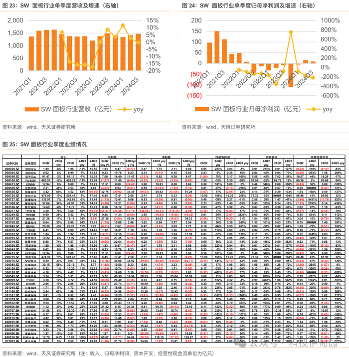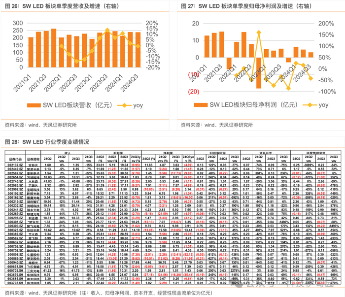 2024Q3 SWLED 板块收入同比下滑 1%,板块利润同比下滑 42%,行业盈利能力承压明显,持续看好 miniled 等新产品放量对于产业链业绩拉动。