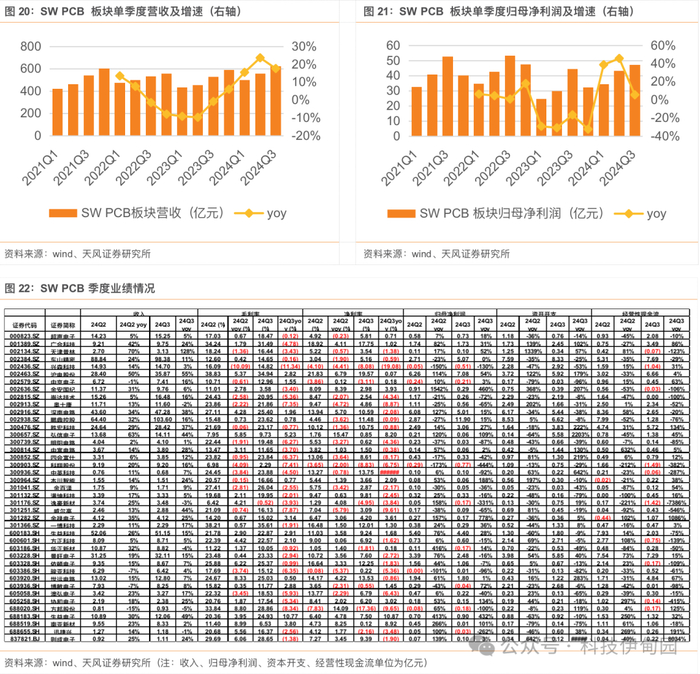 24Q3 PCB 板块收入和利润增速有所放缓,24Q3 SW PCB 板块收入同比增长 18%,板块利润同比增长 6%,增速有所放缓,二季度原材料涨价部分反映在三季度成本增加,影响行业毛利率表现。