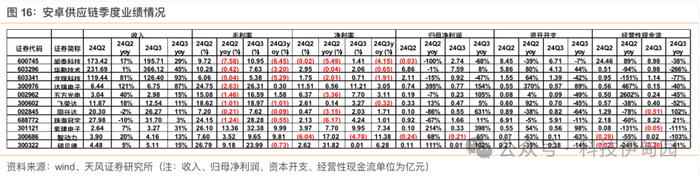 1)苹果手机 24Q3 增长稳健,增速相比 24Q2 有所放缓,24Q1 苹果手机出货量有所下降,为 50.1 百万台,yoy-9.2%,部分受到 22Q4 供给受限部分需求递延导致 23Q1 高基数影响;24Q2 苹果手机出货量为 45.2 百万台,yoy+6.4%;24Q3 苹果手机出货量为 56 百万台,yoy+4.5%,增速有所放缓;