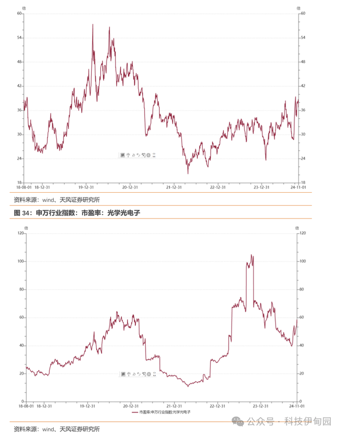 元件及光学光电子板块 24Q3 业绩回顾:1)被动元件: MLCC/电感被动元件 23 年呈现持续复苏趋势,24H1 景气度延续 23 年下半年良好趋势。24Q3PCB 板块收入和利润增长加速,24Q3 SW 被动元件板块收入同比增长 18%,板块利润同比增长 25%,增长提速;2)PCB: 24Q3 PCB 板块收入和利润增速有所放缓,24Q3 SW PCB 板块收入同比增长 18%,板块利润同比增长 6%,增速有所放缓,二季度原材料涨价部分反映在三季度成本增加,影响行业整体毛利率表现,AI 持续驱动 PCB 服务器和交换机下游成长,;3)面板: 24Q3 SW 面板板块收入同比持平,利润同比下滑 22%,盈利能力持续承压,预计国补有效刺激需求淡季价格持稳,看好明年顺周期业绩弹性;4)LED: 2024Q3 SWLED 板块收入同比下滑 1%,板块利润同比下滑 42%,行业盈利能力承压明显,持续看好 miniled 等新产品放量对于产业链业绩拉动;5)光学元件: 24Q3 SW 光学元件板块收入同比增长 8%,板块利润同比增长 76%。水晶光电业绩同环比表现亮眼,主要受益于毛利率提升和费用率下降。