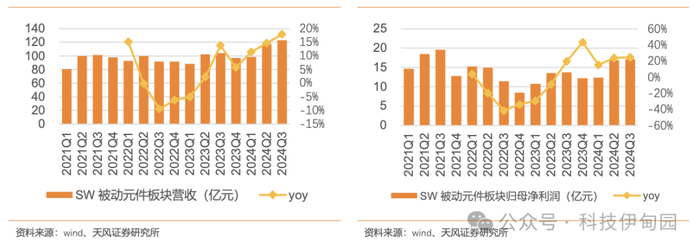 MLCC/电感被动元件行业呈现持续复苏趋势,24Q3 景气度延续 24H1 良好趋势。24Q3PCB板块收入和利润增长加速,24Q3 SW 被动元件板块收入同比增长 18%,板块利润同比增长 25%,增长提速。