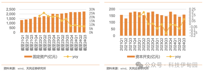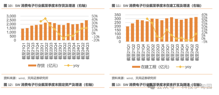 消费电子行业扩产呈现一定复苏趋势。截至 24Q3,消费电子行业存货为 2485 亿元,同比增长 16%,存货规模增速低于收入规模增速,但同比增速较上一季度有所提升。在建工程为 321 亿元,yoy+8%,行业扩产呈现一定复苏趋势。固定资产为 2279 亿元,yoy+8%,资本开支为 159 亿元,yoy+8%,体现行业整体投入呈现一定复苏趋势。
