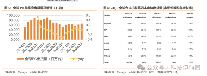 消费电子终端 24Q3 销量情况:智能手机:苹果手机 24Q3 出货量增长稳健,增速相比 24Q2 有所放缓,安卓出货量增速有所放缓,受基数效应和今年部分品牌高端旗舰机型较去年推出节奏有所推迟影响;2)PC: 2024Q3PC 出货量为 66.4 百万台,yoy+1.3%,相比于 Q2季度 yoy+1.2%增速持平,PC 市场延续缓慢复苏趋势。