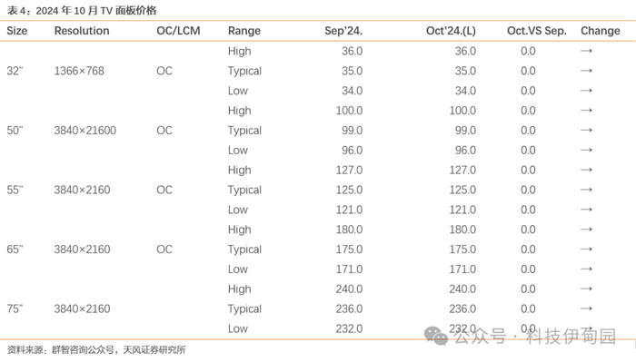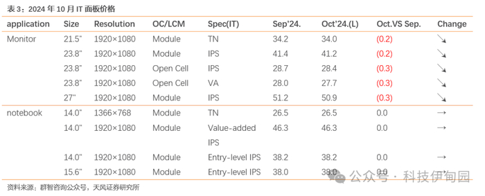 IT 面板价格:Monitor 面板方面,在供需双方因素的共同作用下,10 月 Monitor 面板主流规格价格将继续呈现小幅下降趋势,这一趋势预计将延续至四季度末,直至 25 年一季度逐渐收窄。根据群智咨询公众号数据,21.5"FHD,10 月 Open cell 面板价格和 LCM 价格预计小幅下降$0.2;23.8"FHD,10 月 Open cell 面板价格预计下降$0.3,LCM 价格预计下降$0.2;27"FHD,10 月 Open cell 面板价格和 LCM 价格下降$0.3;中低端 Gaming model面板价格预计下降$0.5,QHD+ Gaming model 面板价格预计下降$0.5~$1。Notebook 面板方面,10 月 TN 面板价格维持稳定,主流 16:9 规格面板价格仍保持稳定。中高阶面板价格则继续小幅下跌。根据群智咨询公众号数据,低端 HD TN:10 月主流 TN LCM 均价预计持平; IPS FHD&FHD+产品,10 月 16:9 主流规格面板价格保持稳定,16:10 入门级规格模组价格持平,部分 16:10 主流规格面板价格小幅下滑。