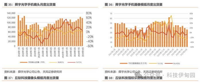 智能手机市场回暖,拉动智能手机光学模组出货量增长。随着宏观经济逐步复苏,智能手机市场需求开始回暖,且高端旗舰机备受消费者青睐,配置潜望式摄像头、高倍数光学防抖、可变光圈和大尺寸超高像素等高端摄像头模组的机型持续增加,同时配备超声波指纹识别模组和光学式指纹识别模组的机型持续增加,有利于手机摄像头模组和指纹识别模组的市场规模持续扩大。舜宇手机镜头出货量在 24H1 同比上升约 23.7%、手机摄像模组出货量同比上升约 13.5%,同时手机镜头和手机摄像模组盈利能力修复,实现了量价齐升。丘钛科技在高端摄像头模组产品、车载摄像头模组产品的业务发展良好,摄像头模组出货量在 24H1 同比上升约 29.6%;其指纹识别模组出货量同比上升约 16.7%,在指纹识别模组业务的市场份额上升。