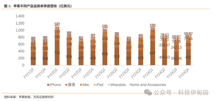 FY24Q4 iPhone 收入创季度新高,同比增长 6%,iPhone 收入在各个地区都有增长。随着Apple intelligence 的引入,iPhone 新时代开启。iPhone 活跃安装数在总量以及各个地区都创历史新高。FY24Q4 中国地区的收入基本持平,部分受益于汇率因素的改善。
