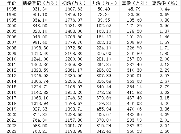 历年结婚登记、初婚、再婚、离婚、离婚率数据。数据来源:《中国统计年鉴2024》