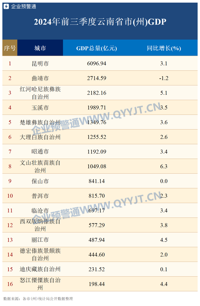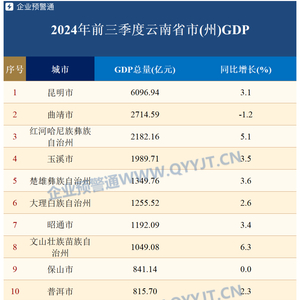 文山州前三季度GDP总量1049.08亿元,同比增长6.3%,GDP增速排名全省第一;昆明市虽然GDP总量遥遥领先,但增速仅高出全省0.1个百分点;曲靖市前三季度GDP同比增速为-1.2%,是唯一一个增速出现负增长的城市。