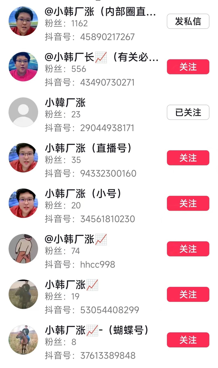 11月7日,记者发现,“小韩厂涨”主号被封后,平台上涌现各种高仿号和小号,都在“小韩厂涨”后加上诸如“(内部圈直播)”、“(我回来了)”、“(这是唯一小号)”等等诸多字眼,难以分辨到底是新开小号还是高仿账号。