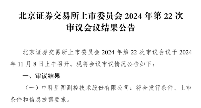 2024年11月8日,中科星图测控技术股份有限公司(以下简称“星图测控”)首次公开发行股票并在北交所申请上市,获北京证券交易所上市委员会2024年第22次审议会议通过,成为安徽省空天信息产业第一家北交所首发上市过会企业。