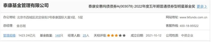 天天基金网显示,泰康基金产品数达148只。