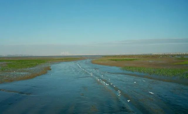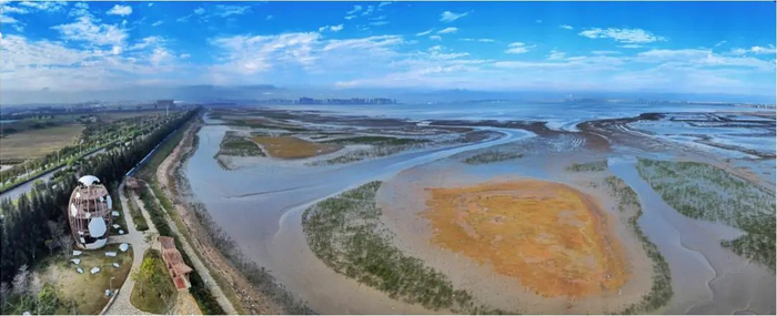 ▲生态海堤-潮沟-红树林-鸟类栖息地干滩