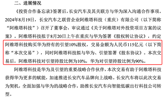 2024年8月19日,长安汽车发布公告,子公司阿维塔科技将斥资115亿元购买华为引望10%股权;8月20日,阿维塔官宣投资华为引望协议签约完成,成为华为引望第二大股东;10月16日,阿维塔已通过自有资金向华为完成了第一笔23亿元的支付。