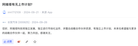直到2024年9月21日,长安汽车在深交所互动易上回复股民“阿维塔有无上市计划”的问题上,回应“阿维塔科技将独立发展,独立进行市场化运作,并整合战略合作伙伴资源,有独立上市计划。”这也是长安汽车首次正面回应。
