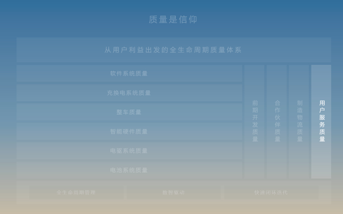 智能电动汽车有着更多的用户使用场景,这也对用户服务质量提出了更高的期待。蔚来用户服务质量所关注的对象超过了狭义的车辆售后服务范畴,自用户提车开始直到车辆使用生命周期结束,用户在产品、服务、社区等维度的触点体验,都涵盖在我们用户服务质量的管理工作中。为此,蔚来依托互联网基因和用户触点分析,建立了一套涵盖售后问题解决、用户服务运营、用户关系管理、售后维修保养等全链路和全场景的质量保证体系,时刻解决用户痛点,确保在每一个服务触点给用户带来「超越期待的全程体验」。
