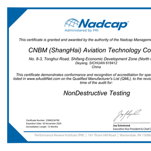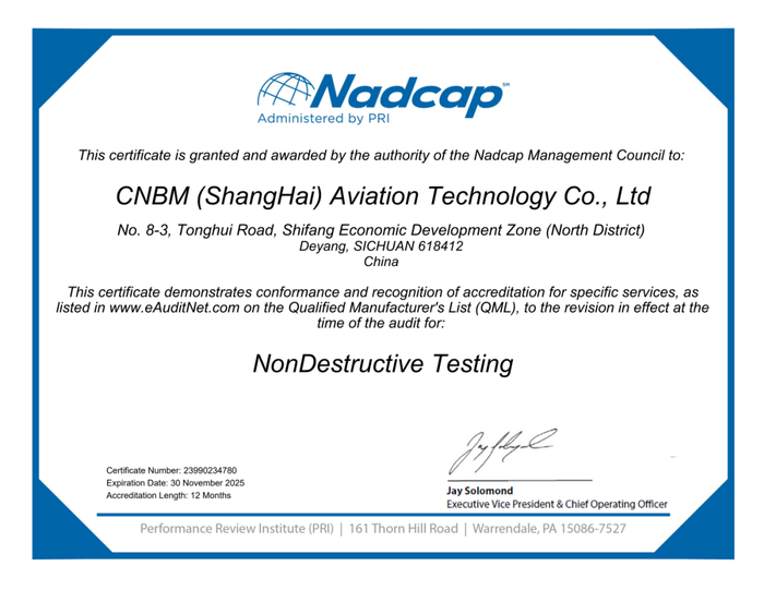 近日,中建材(上海)航空技术有限公司顺利通过美国质量评审协会PRI组织的专项审核,成功获得Nadcap-NDT(无损检测)证书。中建材航空无损检测质量管理水平及检测能力已达到国际航空航天材料检测要求,具备航空航天零部件NDT检测资质。