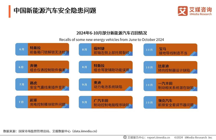 随着新能源汽车的市场占有率迅速提高,新能源赛道的碰撞也更为激烈。不少汽车品牌都意图电动化转型、完善自身体系等方式,以占据新能源市场的一部分,然而却忽略了新能源汽车的质量问题。2021-2024年10月,新能源汽车市场出现了大量汽车召回事件。艾媒咨询分析师认为,汽车厂商应加强汽车生产质量上的管控,给消费者更安心的智能化体验。