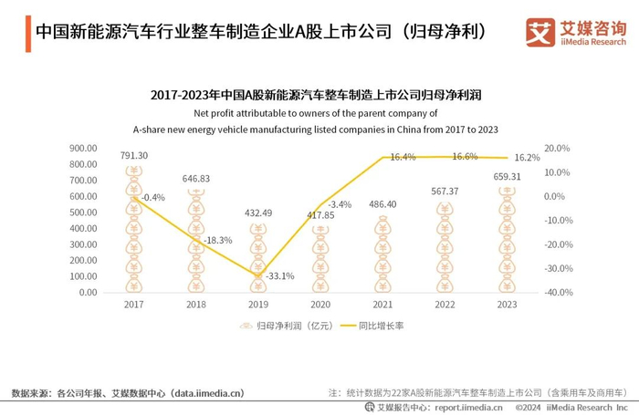 数据显示,2021年中国新能源汽车整车制造A股上市公司披露归属于母公司所有者的净利润同比增长率由负转正,2023年为659.31亿元,同比增长16.2%。艾媒咨询分析师认为,中国新能源汽车上市公司在应对疫情、市场竞争、成本控制方面取得了一定成效,提高了自身的竞争力和盈利能力,使得归母净利润重新回到增长的趋势,增强了自身抗风险能力和发展潜力。