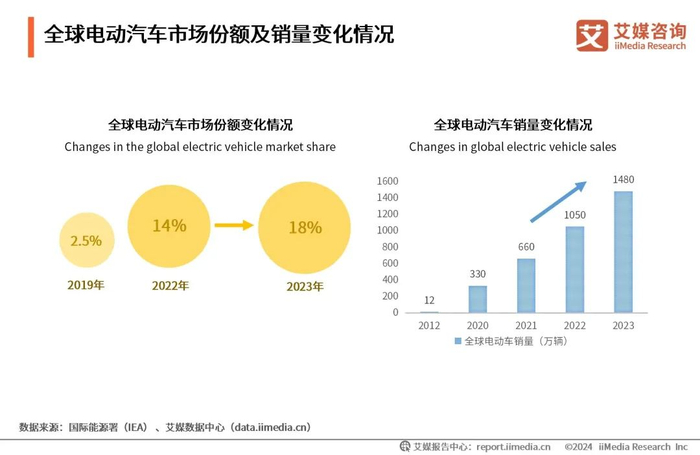 2024年4月23日,国际能源署(IEA)发布《全球电动汽车展望2024》报告。报告指出,2023年全球近18%的汽车销售类型是电动汽车,高于2022年的14%和2019年的2.5%。此外,2023年全球电动汽车销量增长再次打破往年纪录,销售量达到1480万辆,保持强劲增长势头。这表明消费者对电动汽车的接受度在不断提高,全球电动汽车销量的逐年攀升也预示着电动汽车市场在未来仍有巨大的发展潜力。