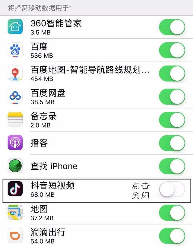 操作方法(ios系统为例):点击设置-蜂窝移动数据-下拉找到你想关掉的APP,点击即可。