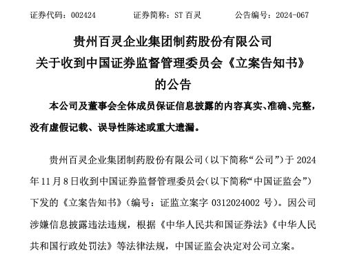 11月8日晚间,贵州百灵企业集团制药股份有限公司(以下简称“ST百灵”或“公司”)发布关于收到中国证券监督管理委员会《立案告知书》的公告。公告透露,因涉嫌信息披露违法违规公司被中国证监会立案调查。