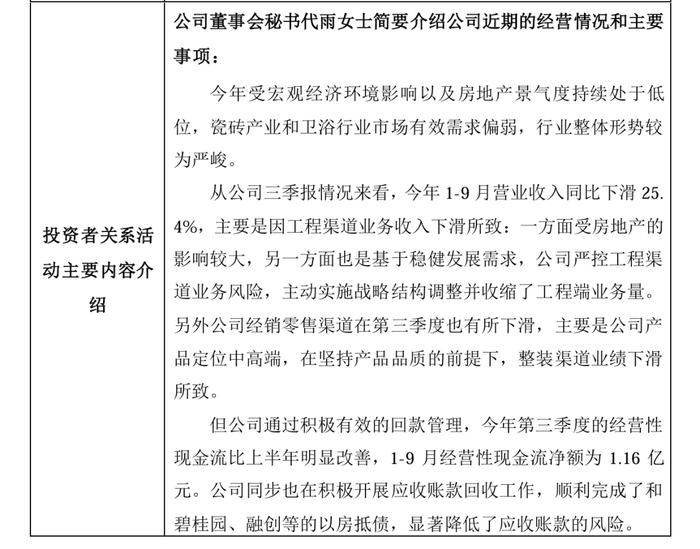 11月1日,帝欧家居发布投资者关系活动记录表显示,从公司三季报情况来看,今年 1-9 月营业收入同比下滑 25.4%,主要是因工程渠道业务收入下滑所致:一方面受房地产的影响较大,另一方面也是基于稳健发展需求,公司严控工程渠道业务风险,主动实施战略结构调整并收缩了工程端业务量。另外公司经销零售渠道在第三季度也有所下滑,主要是公司产品定位中高端,在坚持产品品质的前提下,整装渠道业绩下滑所致。