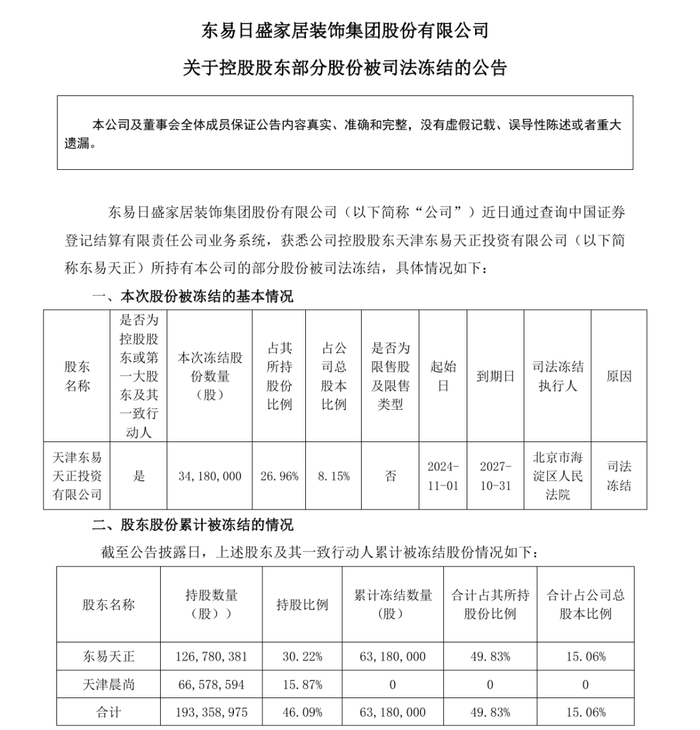 11月4日,东易日盛公告披露,控股股东天津东易天正投资有限公司持有的34180000股公司股份被北京市海淀区人民法院司法冻结,占公司总股本的8.15%。此次冻结起始日为2024年11月1日,到期日为2027年10月31日。东易天正正积极与法院沟通,力争尽快解决相关问题,但不排除被冻结股份后期被法院强制执行的可能。