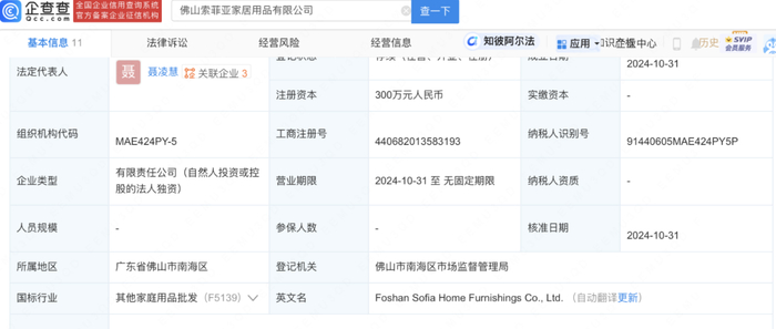 企查查APP显示,近日,佛山索菲亚家居用品有限公司成立,法定代表人为聂凌慧,注册资本300万人民币,经营范围含日用木制品销售、人工智能硬件销售、智能基础制造装备销售等。企查查股权穿透显示,该公司由索菲亚全资持股。索菲亚家居用品有限公司成立,不仅标志着索菲亚在智能家居领域的进一步布局,也突显了人工智能硬件在家居生活中的潜力与重要性。