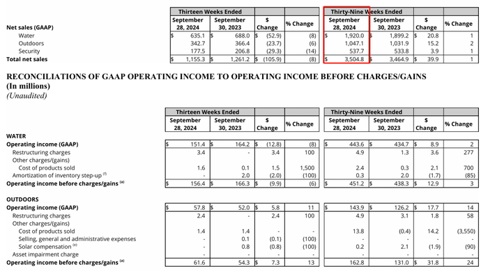 11月6日,富俊集团(FBIN)发布2024年前三季度报告。1-9月销售额35.05亿美元,同比增长1%,其中水创新业务销售额19.20亿美元,同比增长1%。前三季度营业利润5.60亿美元,同比增长16%,其中水创新业务营业利润4.44亿美元,同比增长2%。