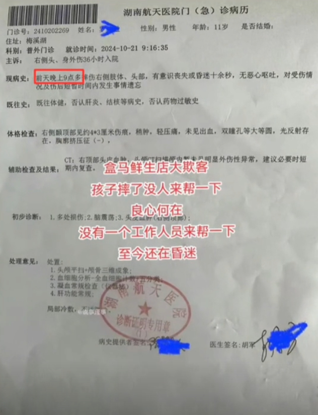 据网友爆料,10月19日晚9点多,一名男孩在盒马鲜生超市内奔跑时不慎摔倒,导致短暂晕厥,孩子的家长称店内工作人员当时冷眼旁观。事后,孩子母亲因认为超市员工未及时扶起孩子而选择砸店讨说法。