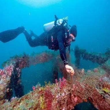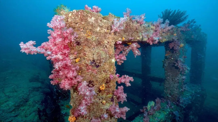 ▲蜈支洲岛人工鱼礁上附着新生的珊瑚