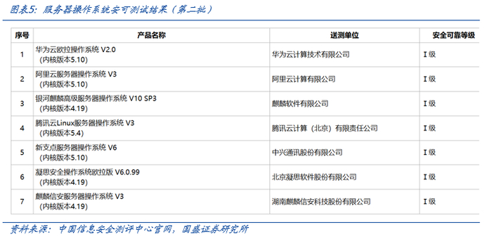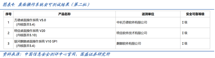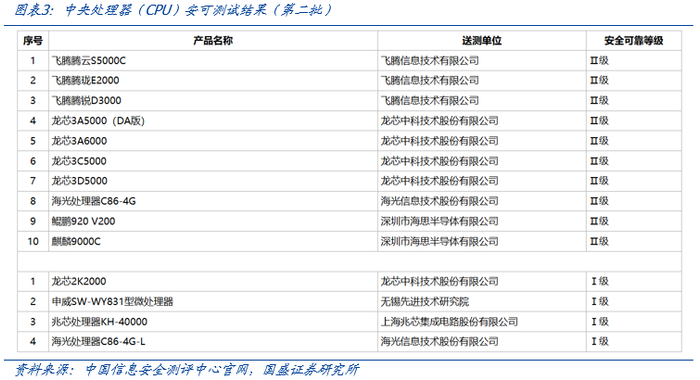 2024年5月,《安全可靠测评结果公告(2024年第1号)》在中国信息安全测评中心官网正式发布。本次共入围14款CPU:10款安全可靠等级为Ⅱ级(龙芯4款、飞腾3款、鲲鹏1款、麒麟1款、海光1款);4款安全可靠等级为I级(龙芯1款、申威1款、兆芯1款、海光1款)以及3款桌面操作系统(麒麟软件、统信、中科方德各1款)和7款服务器操作系统(麒麟软件、华为云、阿里云、腾讯云、新支点、凝思、麒麟信安各1款)。