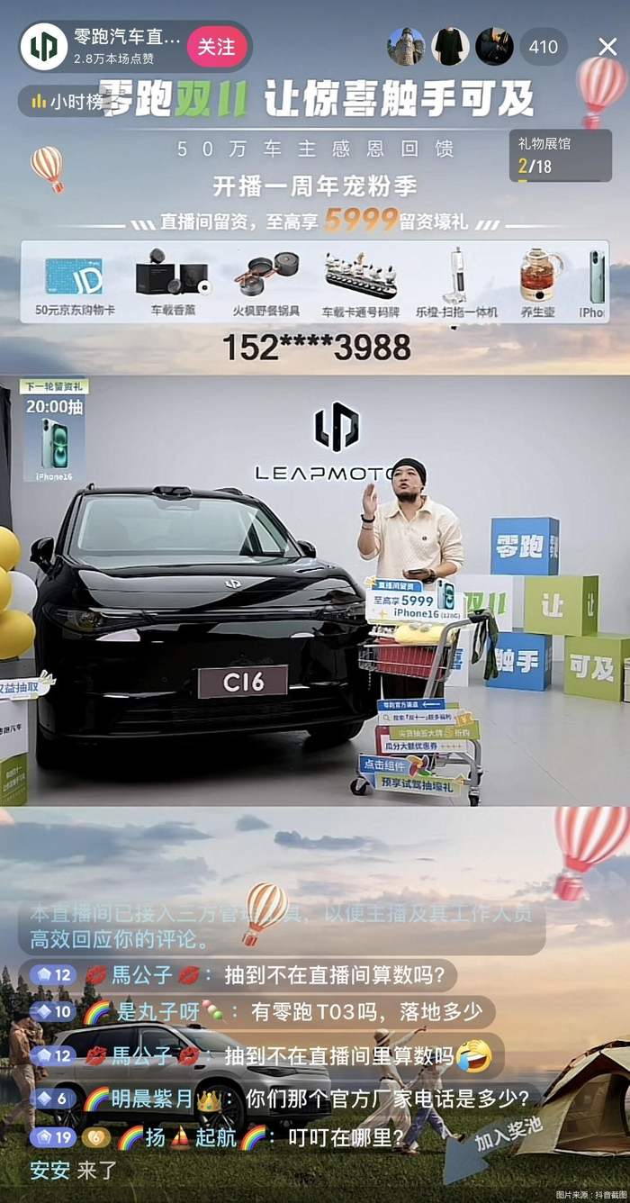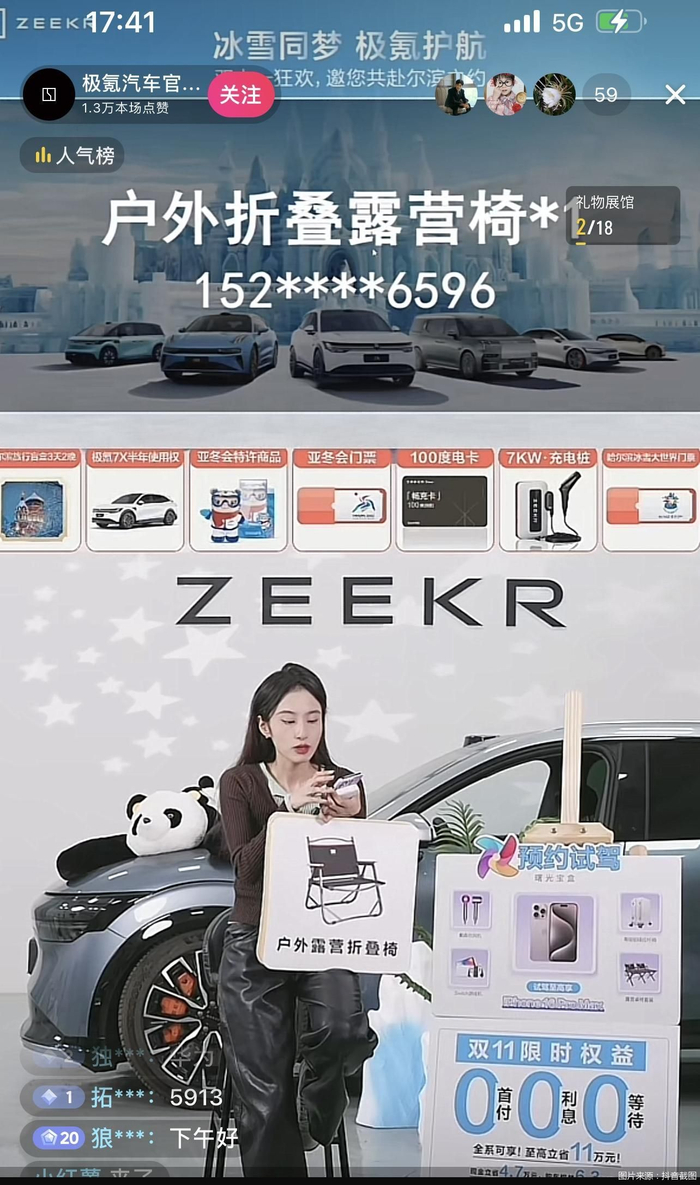 不仅借“大V”直播间造势,各车企直播间也针对“双11”活动进行全天直播并通过抽奖为品牌引流。其中,极氪汽车宣布,今年11月底前购买极氪全系车型可享限时购车政策,其中包括0首付0利息、政府置换补贴、限时购车权益等,最高可省11万元。一位极氪汽车展厅销售人员表示:“极氪旗下车型很少推出优惠活动,但此次针对‘双11’给出较大的优惠力度。”同时,在极氪汽车官方直播间,“双11”限时权益的宣传板也被摆上“C位”,主播则在介绍具体限时权益的同时回答消费者提出的问题。为进一步集客,极氪汽车直播间还开启线上抽奖,奖品包括吹风机、户外折叠椅等。此外,零跑汽车官方直播间推出的“双11”抽奖活动中,主播表示,参与抽奖的消费者不需要到门店看车、试驾也不强制买车,只需要选择车型进行预约。据了解,零跑汽车该场直播获赞超3万。但北京商报记者点击零跑汽车发布的链接发现,预约专属抽奖项目仍需参与者输入手机号并选择意向购车城市,才能参与抽奖。
