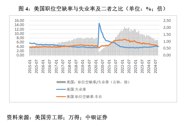 降息之后的就业数据显示,美国劳动力市场依然保持韧性。10月份,失业率为4.1%,持平前值,低于7、8月份的4.3%和4.2%,相当于2015至2019年月均值的0.93倍。9月份,职位空缺率与失业率之比为1.10倍,相当于疫情前五年趋势值的1.13倍(见图4)。
